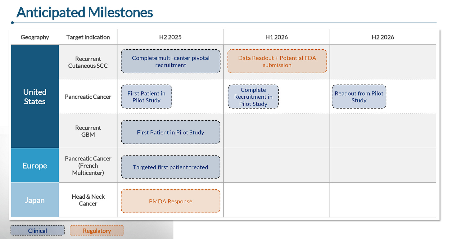 Pancreatic cancer, likely its most exciting program currently, has reported significantly better data vs. SoC despite employing only 20-55% tumor coverage, suggesting topline data from its 30-patient US trial expected in 3Q26 could show even greater efficacy.
