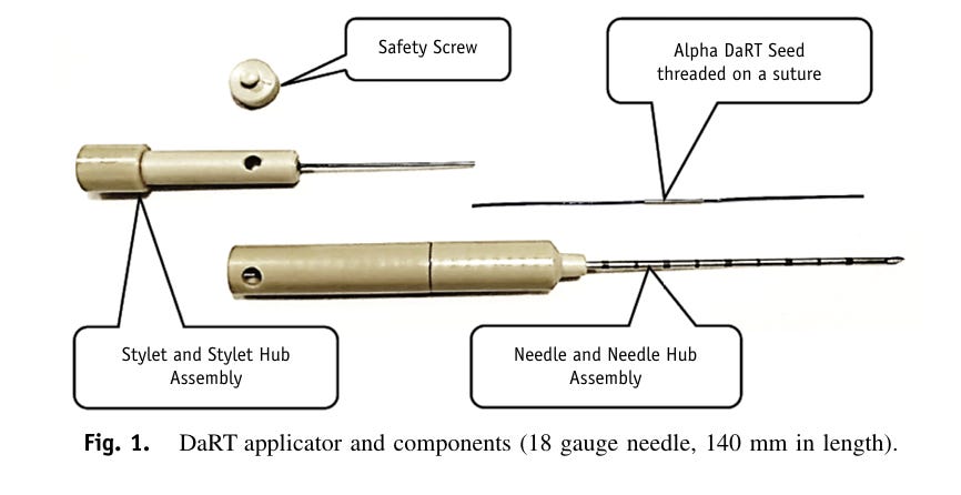 The company’s device and procedure, Alpha DaRT, involves the insertion of “sources” (stainless steel or titanium needles) that are coated with Radium-224 directly into the tumor. As the Radium-224 decays, it recoils off of the source, emitting alpha particles and penetrating deeper into tissue as it continues down its six-leg decay chain. This allows for 500-1,000x enhanced tissue penetration of the alpha radiation (vs. its natural penetrance), which so far has enabled the beginnings of what appear to be best-in-class efficacy (and safety) in multiple solid tumor types.