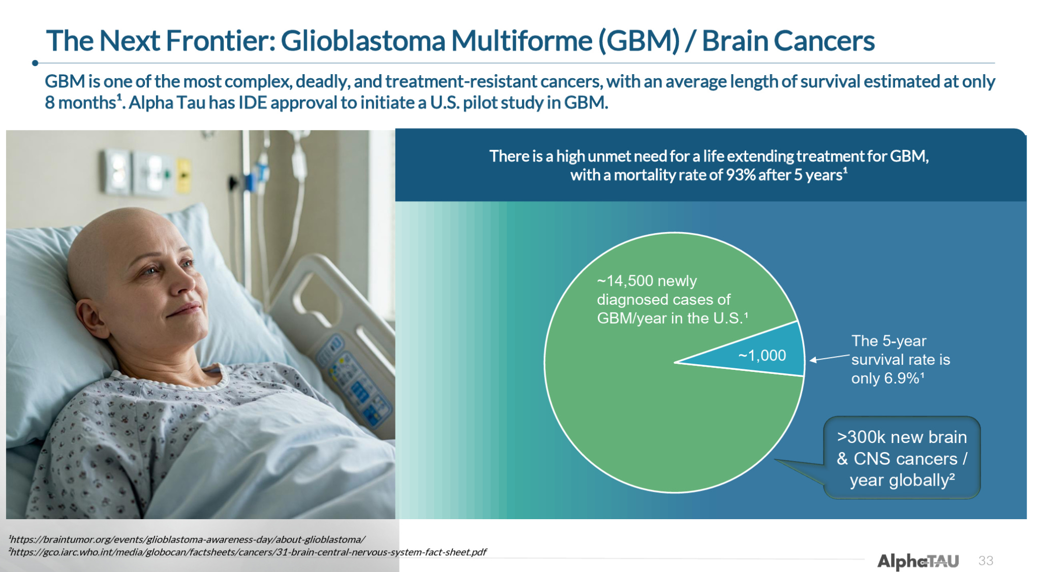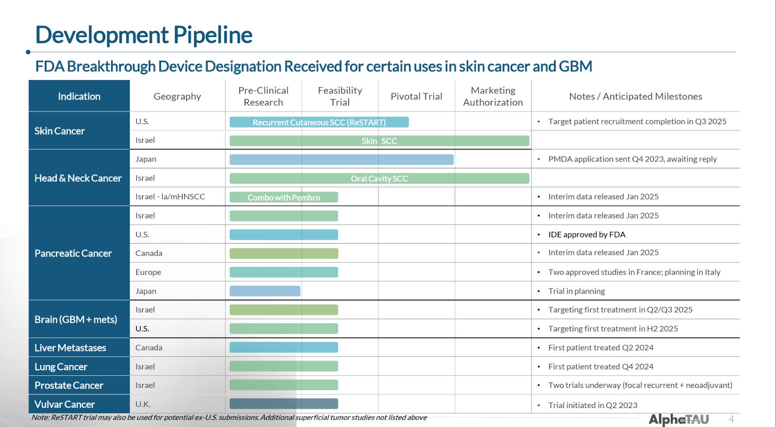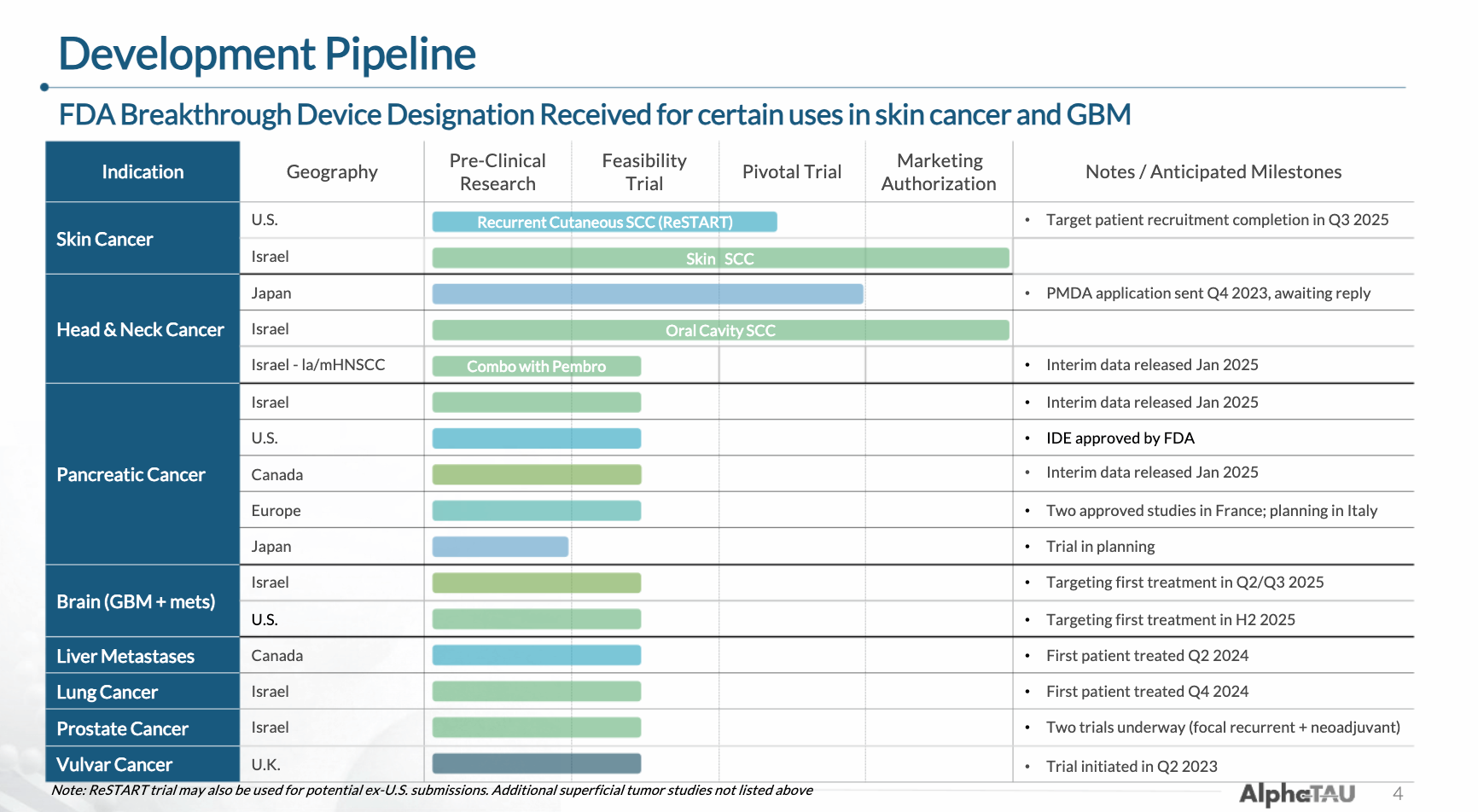 Beyond these primary indications, and with significant support from investigators both in its homeland Israel and internationally, Alpha DaRT is currently being trialed in a number of different cancers. Notably, Alpha DaRT is expected to enroll its first patient in a trial in glioblastoma multiforme (GBM), for which it has Breakthrough Device Designation, in the US by year end.