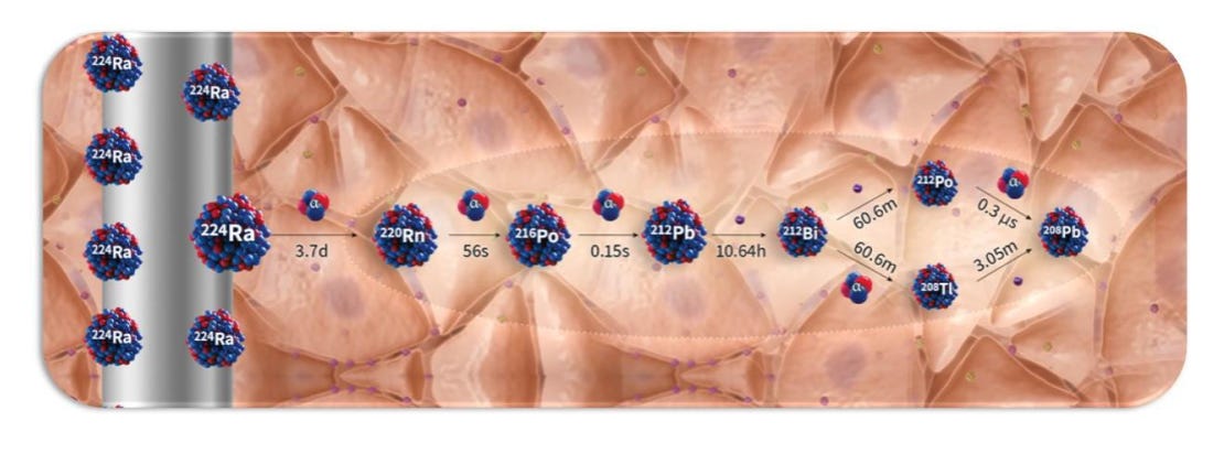 Alpha DaRT (Diffusing α-emitters Radiation Therapy) involves the injection of thin metallic seeds (tiny metal rods made of either steel or titanium) that have been coated with Radium-224 directly into tumors. After implantation, short-lived daughters of the Radium-224, such as Radon-220, Polonium-216, and Lead-212 recoil off of the metal seed and deeper into the tissue, suffusing the tumour with high-linear energy transfer (LET) alpha particles, while sparing most of the surrounding healthy tissue and avoiding systemic exposure. The seeds are either removed after 3-4 weeks or, in some cases, are left inside the body.