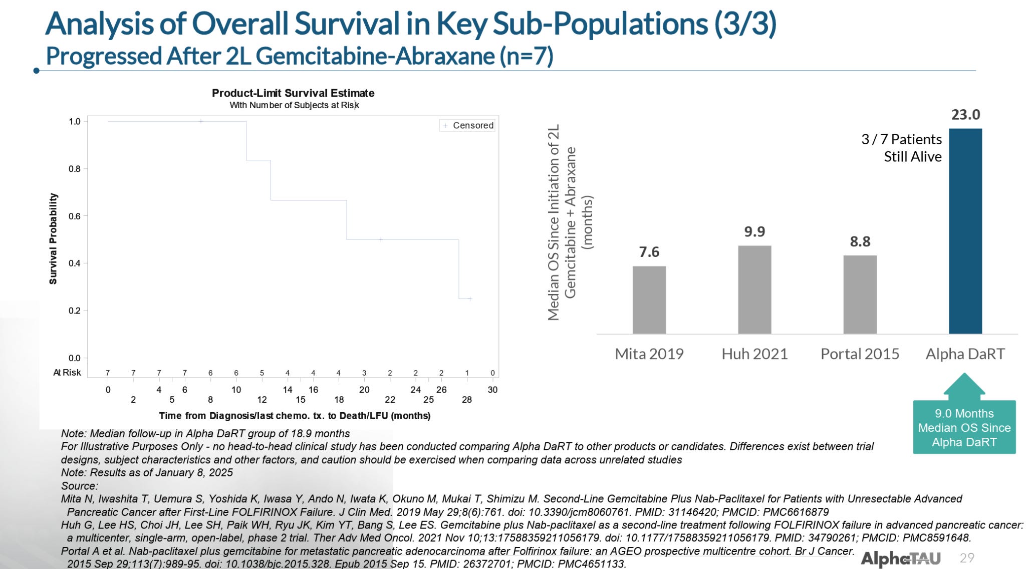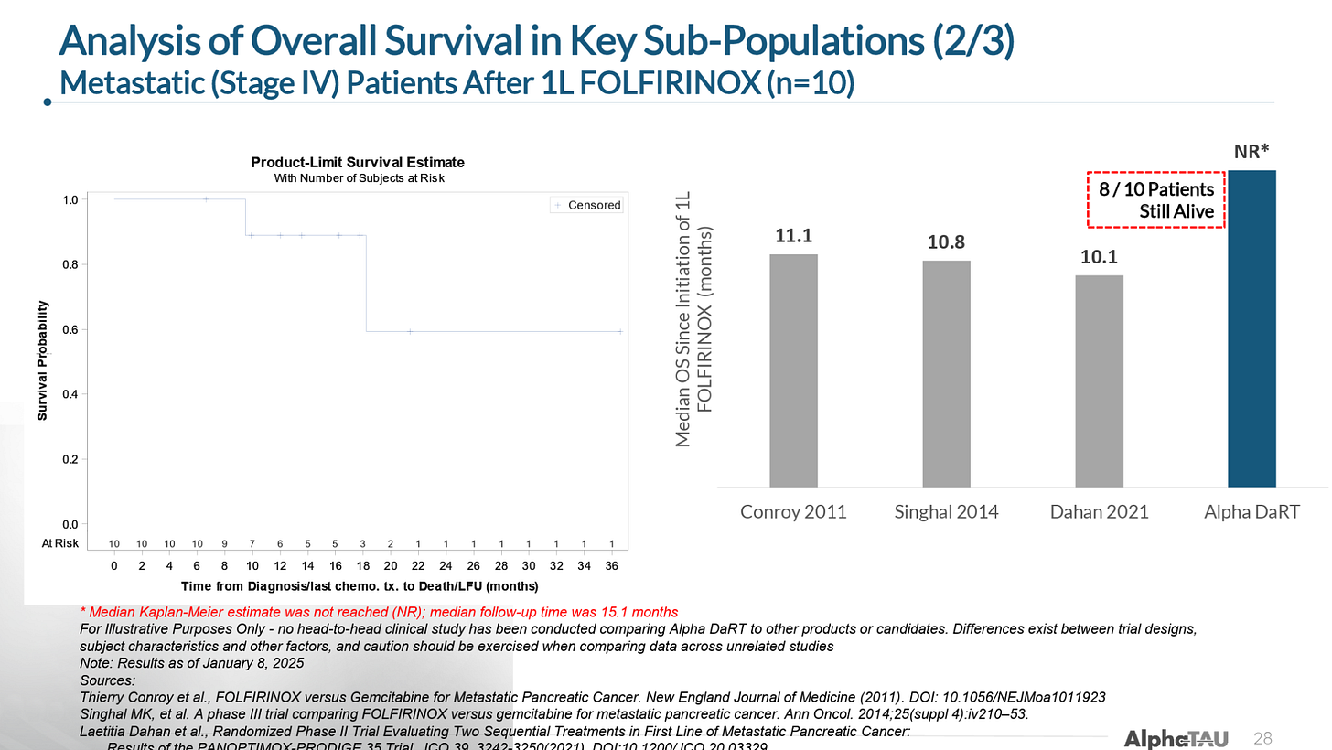 In Stage IV metastatic patients that had received and progressed on first-line FOLFIRINOX (a combination of five chemotherapy agents), Alpha DaRT had extended mOS to at least 15.1 months as of the data cutoff (with 8 of 10 patients were still alive) versus 10-11 months mOS for FOLFIRINOX treatment. (Note: a small number of these patients continued receiving FOLFIRINOX concurrently with Alpha DaRT).