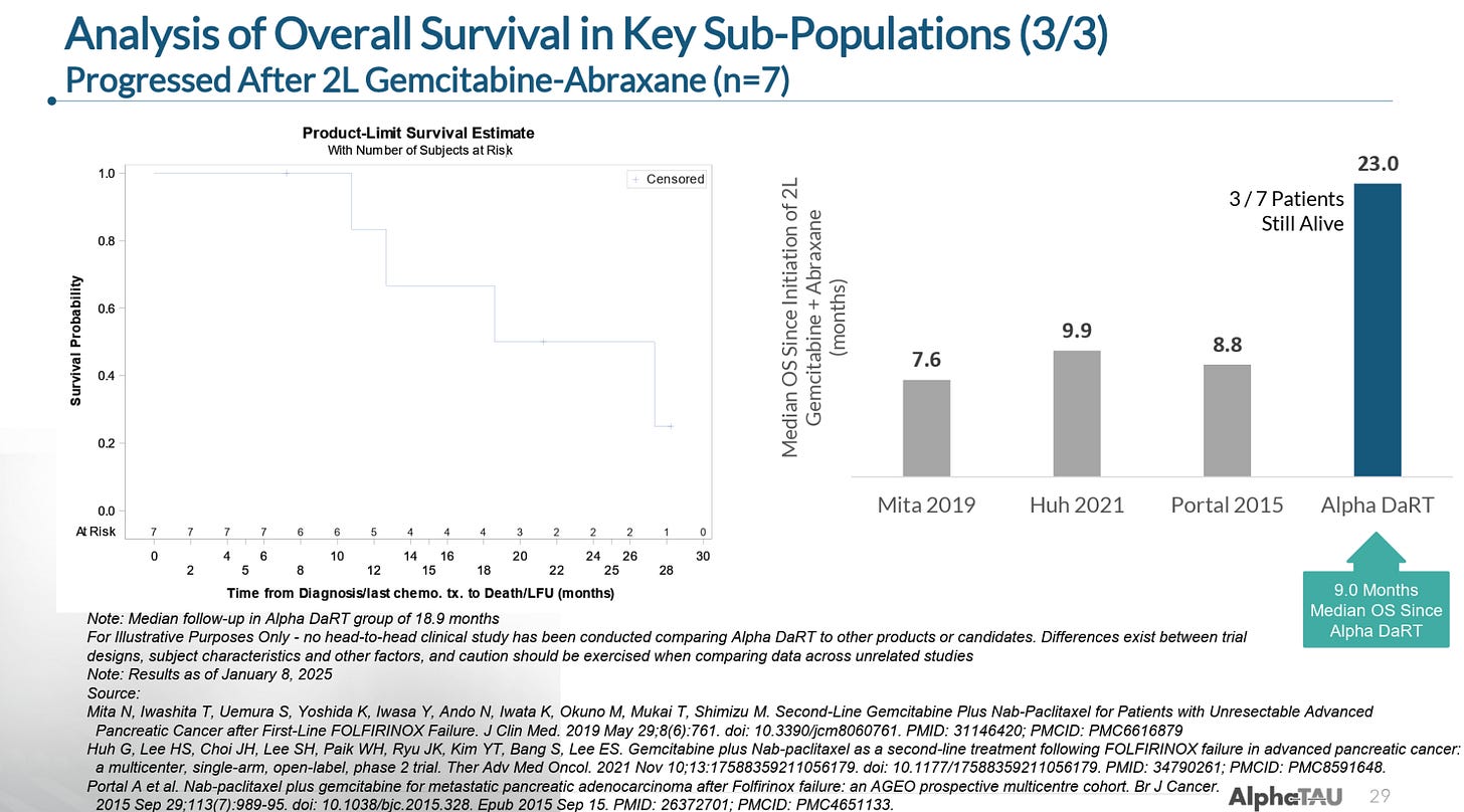 In patients that had failed second-line gemcitabine-piclataxel (GnP), Alpha DaRT extended mOS to 23 months versus the 7.5-10 months of mOS seen with GnP. These patients also had a mOS of 9 months from the time of receiving Alpha DaRT, which means that third-line pancreatic cancer patients with essentially no other treatment options had a 9 month mOS on Alpha DaRT monotherapy.