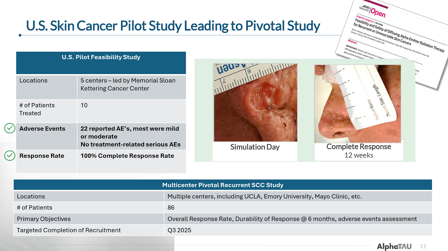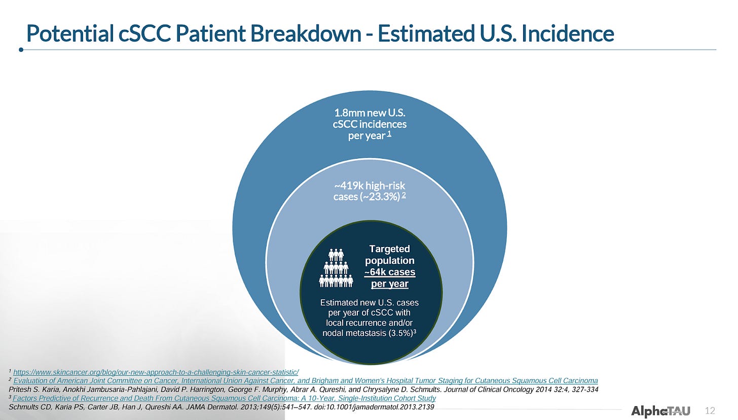 While Alpha DaRT’s mechanism is applicable to essentially any solid tumor type, the company originally focused on external/superficial tumor types like cSCC and HNSCC due to the practical advantages and the ability to easily monitor improvements. More recently, Alpha Tau began expanding into cancers with severe unmet need like pancreatic and glioblastoma.