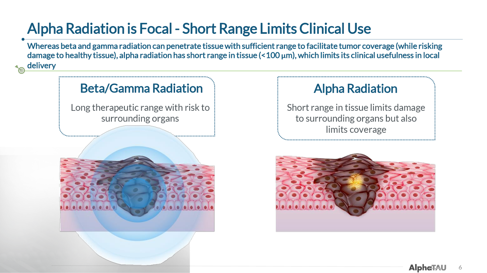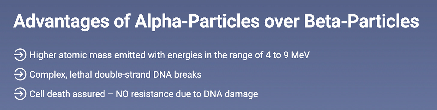 The only other viable application of alpha radiation to date has been radiopharmaceuticals, which are highly localized to cells expressing specific druggable target proteins, allowing for minimal off-target effects but also limiting application to a handful of cancer indications (e.g. prostate, GEP-NETs). These are still clinical-stage.