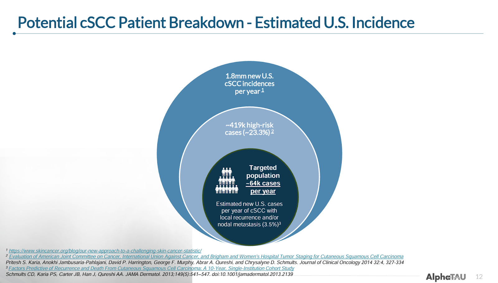 Despite relatively high response rates seen with surgical resection (e.g. Mohs; used in the majority of patients), non-surgical local treatments (e.g. cryotherapy, photodynamic therapy; used in very early-stage disease), and EBRT (used alone and in combination with surgery or therapeutics), a fair number of patients are either ineligible for or fail these treatments. Alpha Tau will target the approximately 64k patients in the US that have tumor recurrence after surgery or EBRT and patients with local metastasis.
