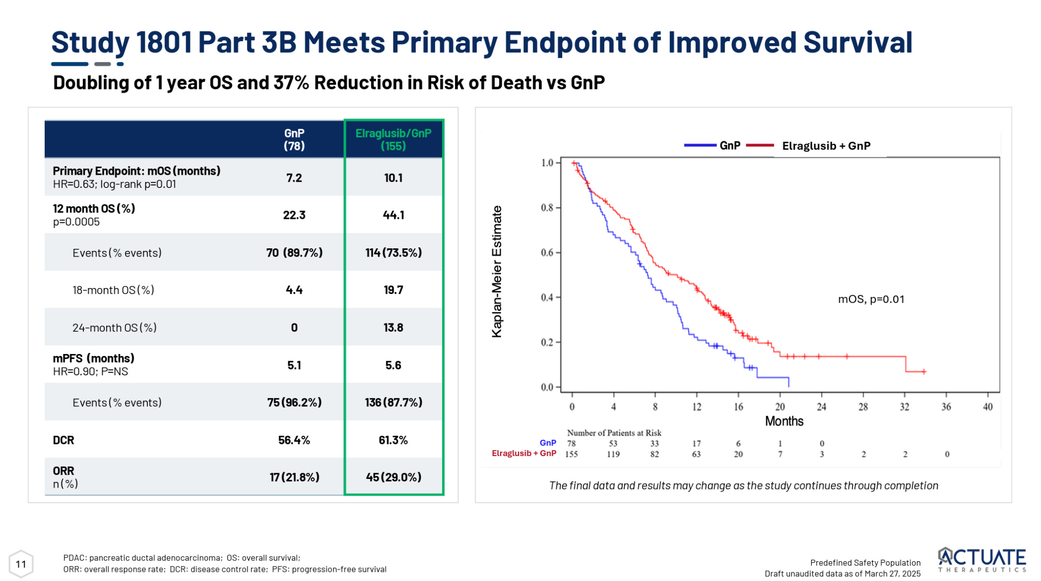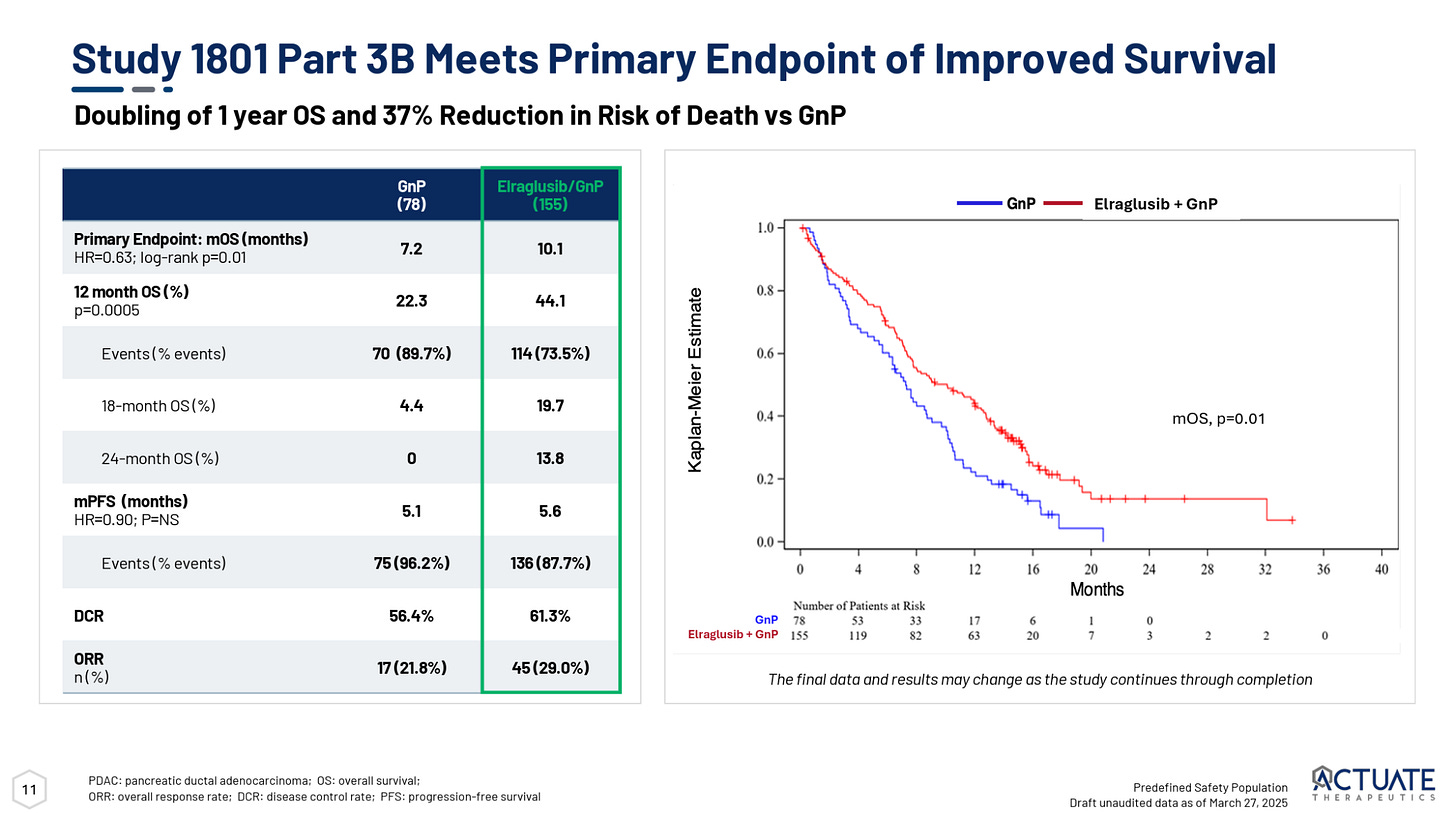 While these data represent an improvement over standard of care, they weren’t quite as impressive as Actuate’s earlier Phase 2 trial which showed a 15.3 month mOS and actually reported two CRs.