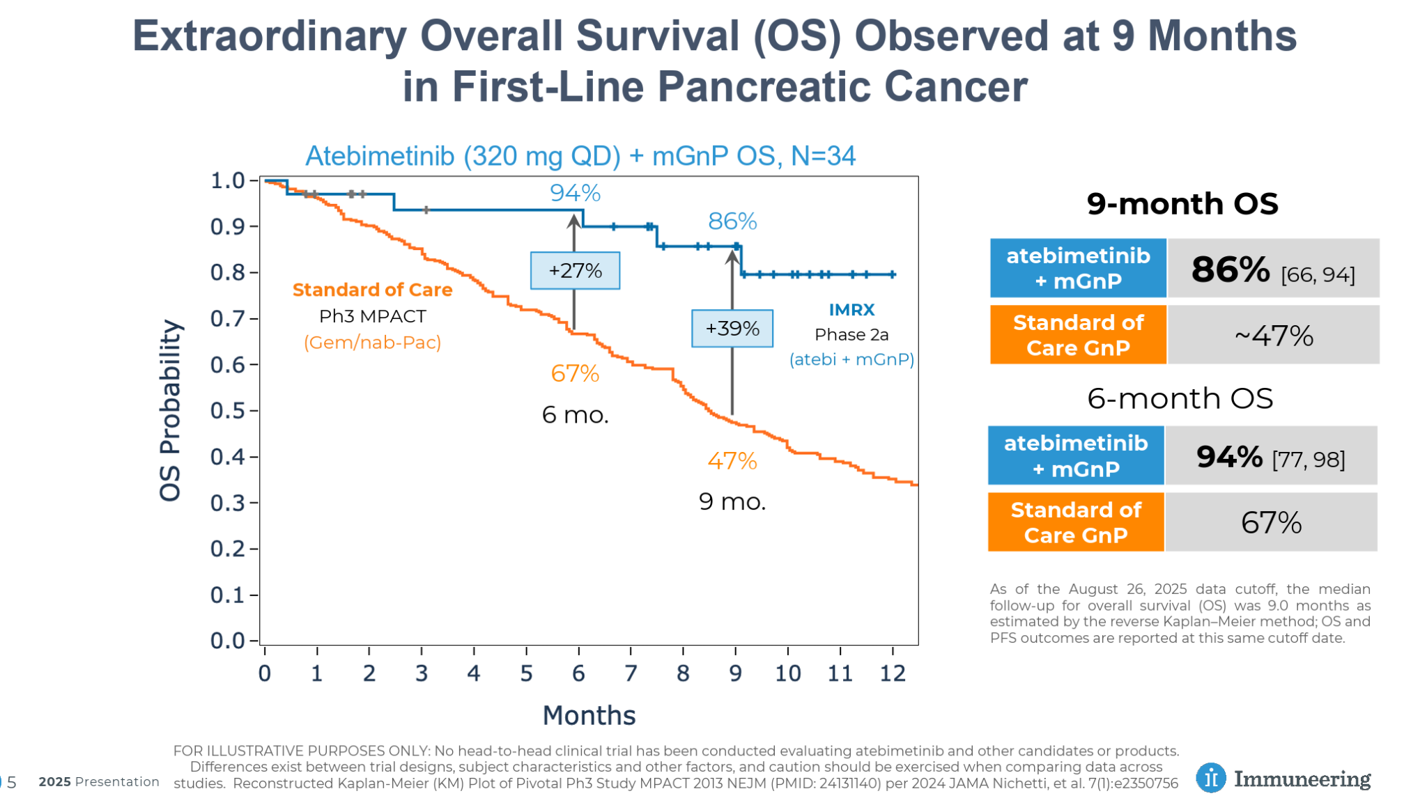 The company plans to complete enrollment of the trial in the 1Q26, with topline results expected in 3Q25. While patients will likely have to be monitored for longer periods to show mOS superiority vs. standard of care, the company should be able to report response and early PFS (6- or 9-month) data in 3Q26.