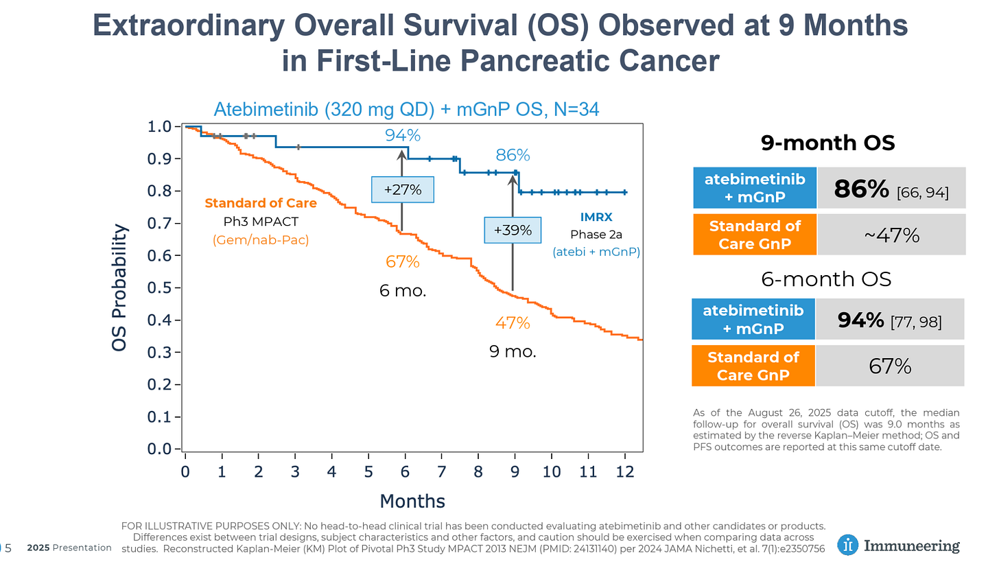 Immuneering’s MEK inhibitor atebimetinib has reported impressive Phase 2a data in combination with GnP in first-line pancreatic cancer patients, showing 86% OS at 9 months versus 47% for GnP alone.