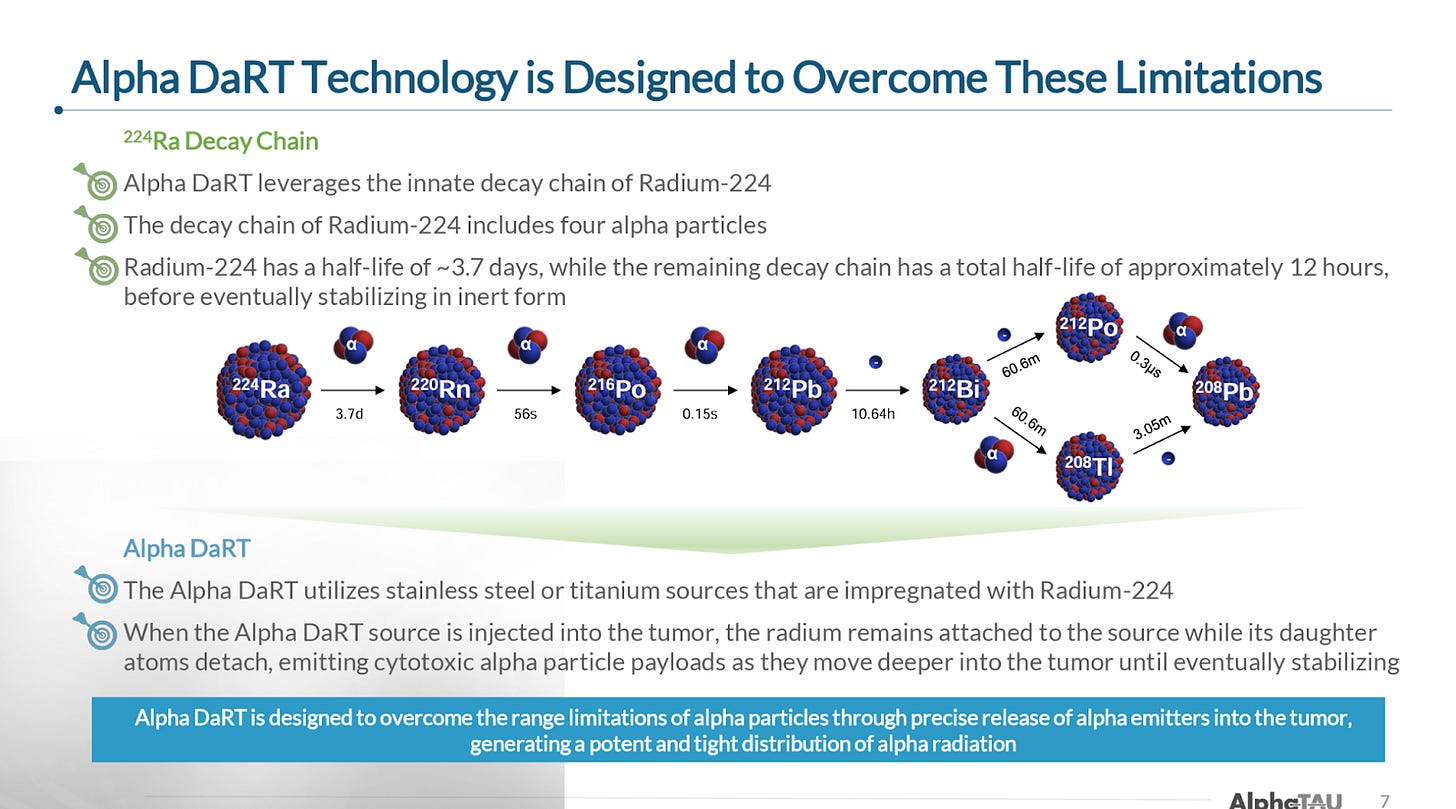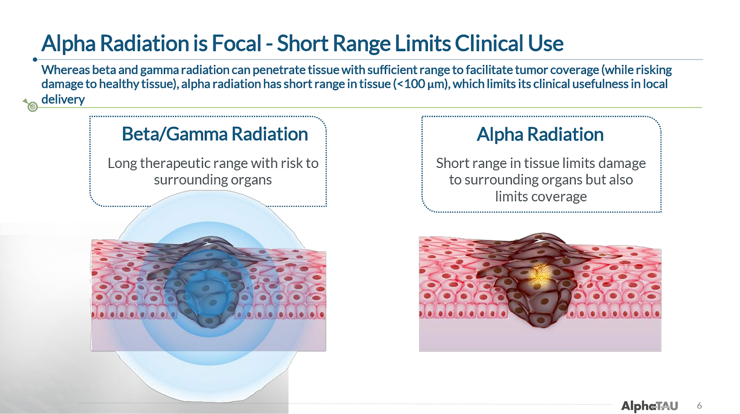 One of Alpha DaRT’s key innovations is the way that Alpha Tau traps the Radium-224 on the surface of the metallic seed, which allows the daughter particles to recoil off of the source/seed, allowing the isotopes to penetrate 4-5 mm into tissue, which is roughly 500-1,000x further than the ~40-90 microns that alpha-emitting isotopes normally penetrate through human tissue. The limited tissue penetrance of alpha particles has been one of the primary impediments to their utilization in radiation therapy, and why targeted alpha radiopharmaceuticals have been the first successful application of alpha particles (because they deliver the radioisotope directly to the desired cells).
