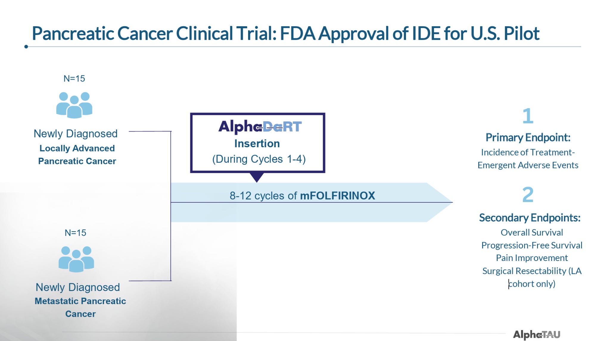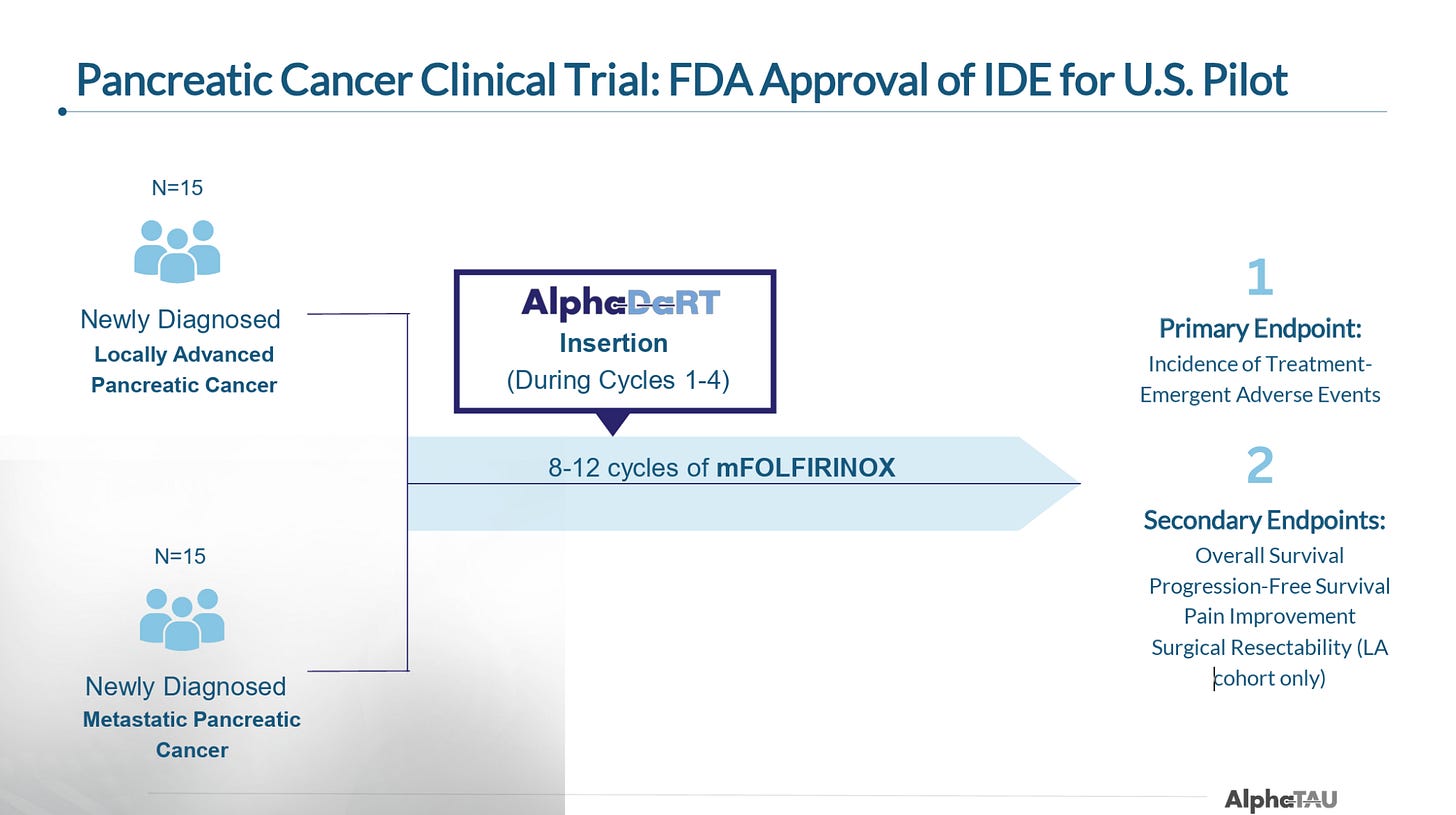 In early September, Alpha Tau announced that it treated the first patient in its 30-patient US trial. This trial is set to enroll 15 newly diagnosed metastatic and 15 newly diagnosed locally-advanced pancreatic patients and will administer Alpha DaRT during a course of modified FOLFIRINOX (mFOLFIRINOX). As noted, this will be the first time Alpha DaRT is trialed as in combination with SoC.