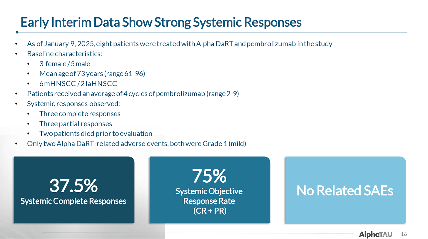 While the sample size is quite small and we will await an update on the durability of these responses, the early efficacy signals are promising. Unfortunately, though this trial was designed to enroll up to 48 patients, an interim analysis deemed the trail successful in demonstrating Alpha DaRT’s proof of concept and enrollment was stopped shortly after the January data update.