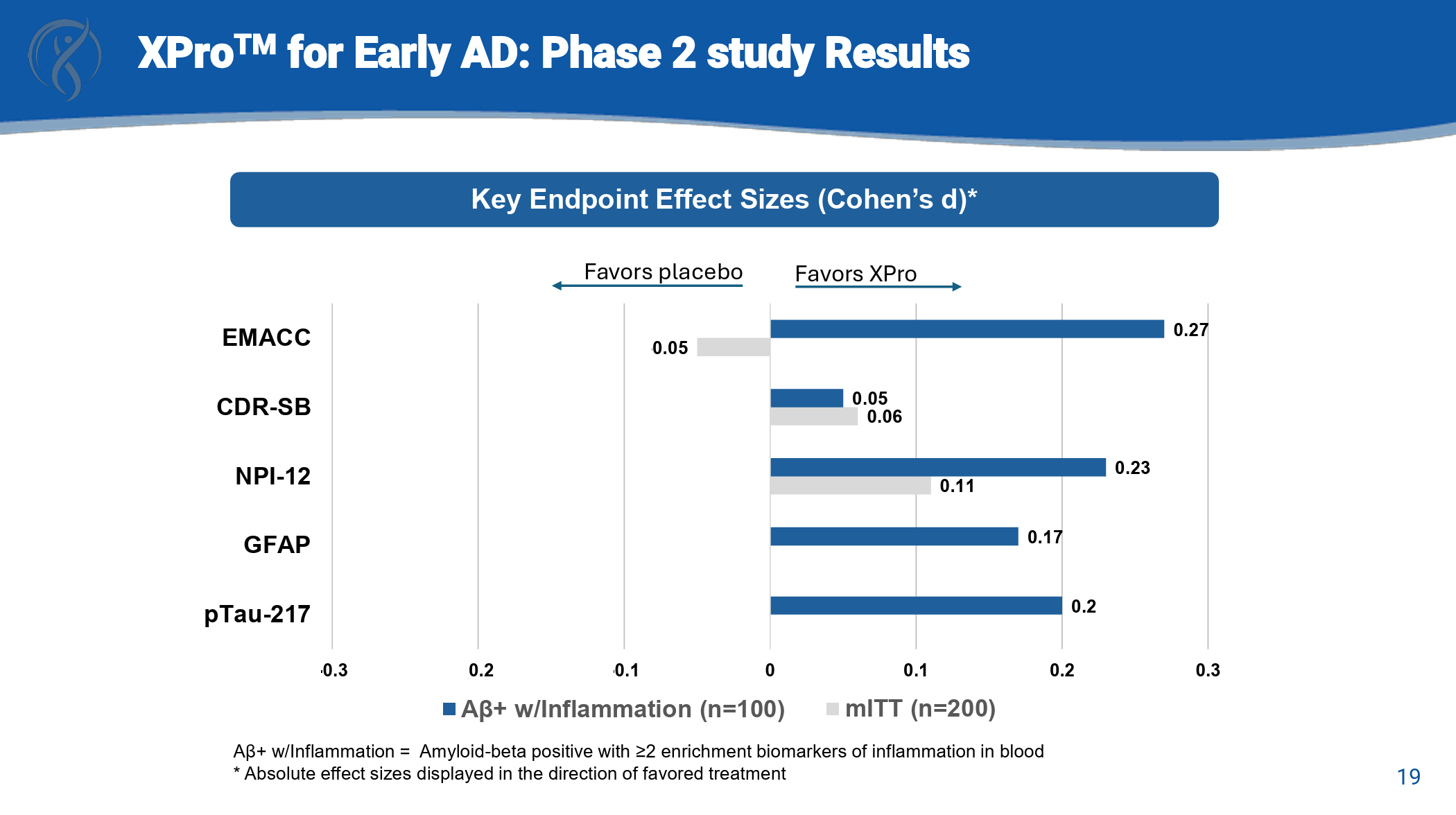 While it isn’t worth doing a full autopsy, you can see some of the details of the results in the company’s updated corporate slide deck. You can see below how XPro1595 failed to show any difference in cognition, and actually showed a worsening on some endpoints, in its mITT population (the closest thing to the total study population). The subgroup analysis that they focus on is patients with an amyloid bet positive test (even though every patients was supposed to be amyloid positive according to the trial protocol) and two or more biomarkers of inflammation. The results even in this sub-analysis weren’t all that compelling, with only Cohen’s d effect sizes being reported, no actual results for the placebo and treatment groups given, no p-values given…