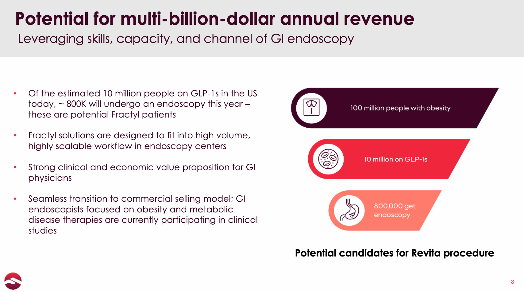 Fractyl also has the interesting option of potentially positioning Revita as an add-on procedure to the 800k GLP-1 patients that will undergo an endoscopy each year. The kicker here is that, according to the company, most gastroenterologists/anesthesiologists already require that patients stop GLP-1 medicine prior to an endoscopy due to the slowed gastric emptying. This could be a natural “GLP-1 off-ramp” offered to patients that allows Revita to seamlessly penetrate its market opportunity.