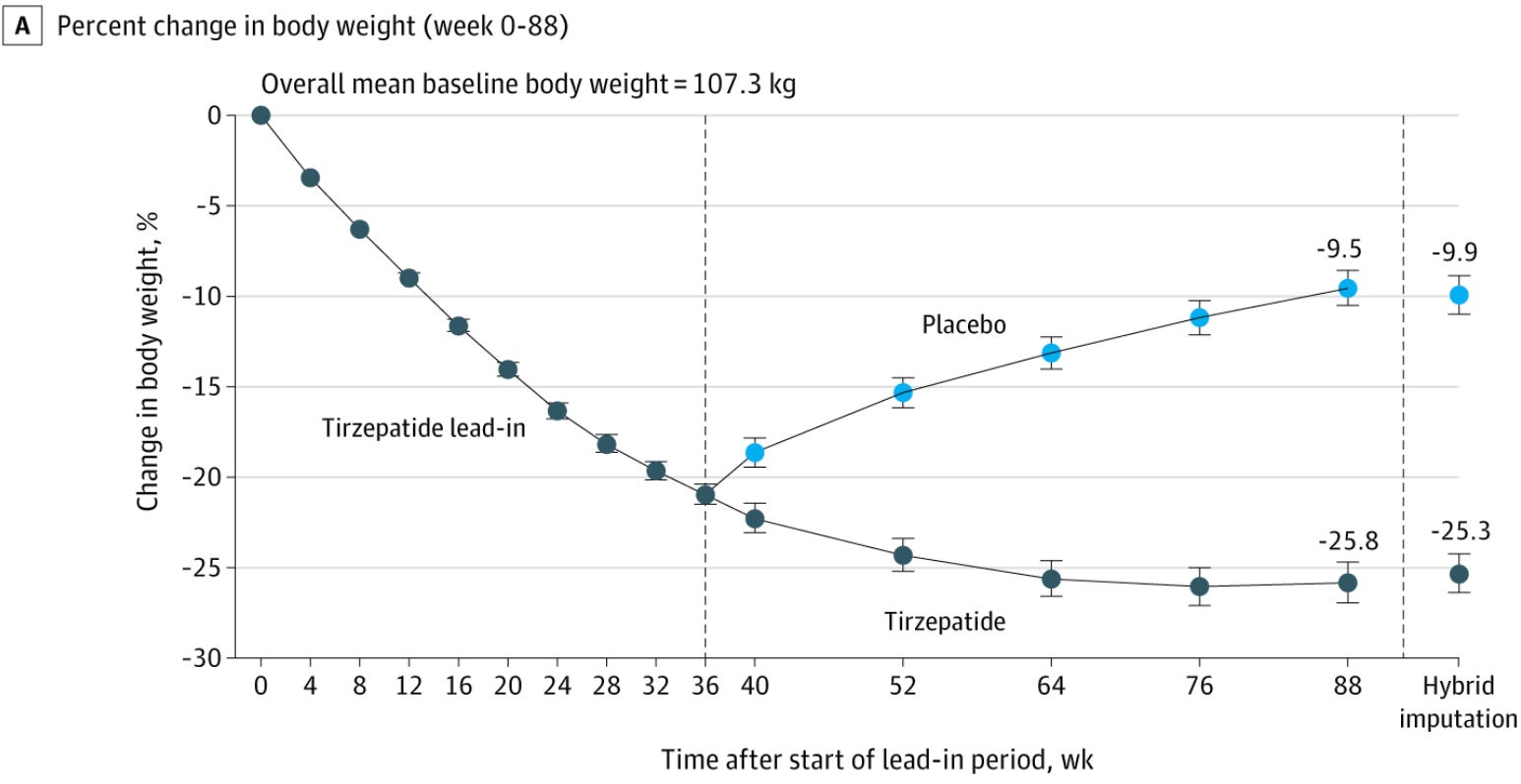 Here is the data plotted against the 5-6% total bodyweight gain from Lilly’s SURMOUNT-4 trial: