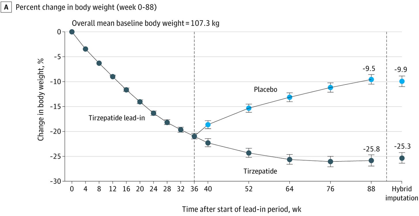 There have been a few large studies measuring the GLP-1 discontinuation rebound effect. The SURMOUNT-4 trial treated 670 patients with tirzepatide for 36 weeks, during which they lost an average of 21% of their bodyweight, then took half of the patients off of tirzepatide and observed them for 52 weeks. Over that time, the discontinued patients gained back 55% of the weight that they had lost (equivalent to a 14% bodyweight gain), while patients remaining on tirzepatide continued to lose weight.