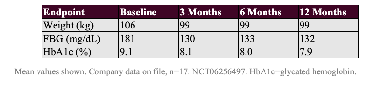 These patients lost 6.6% of their bodyweight by Month 3 and sustained the weight loss to Month 12, and reported a 1.0% HbA1c reduction at Month 3 that deepened further over time.