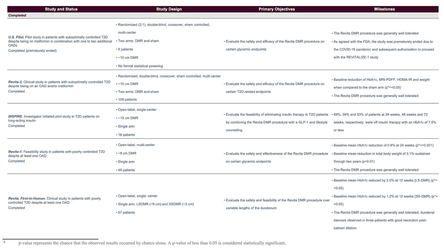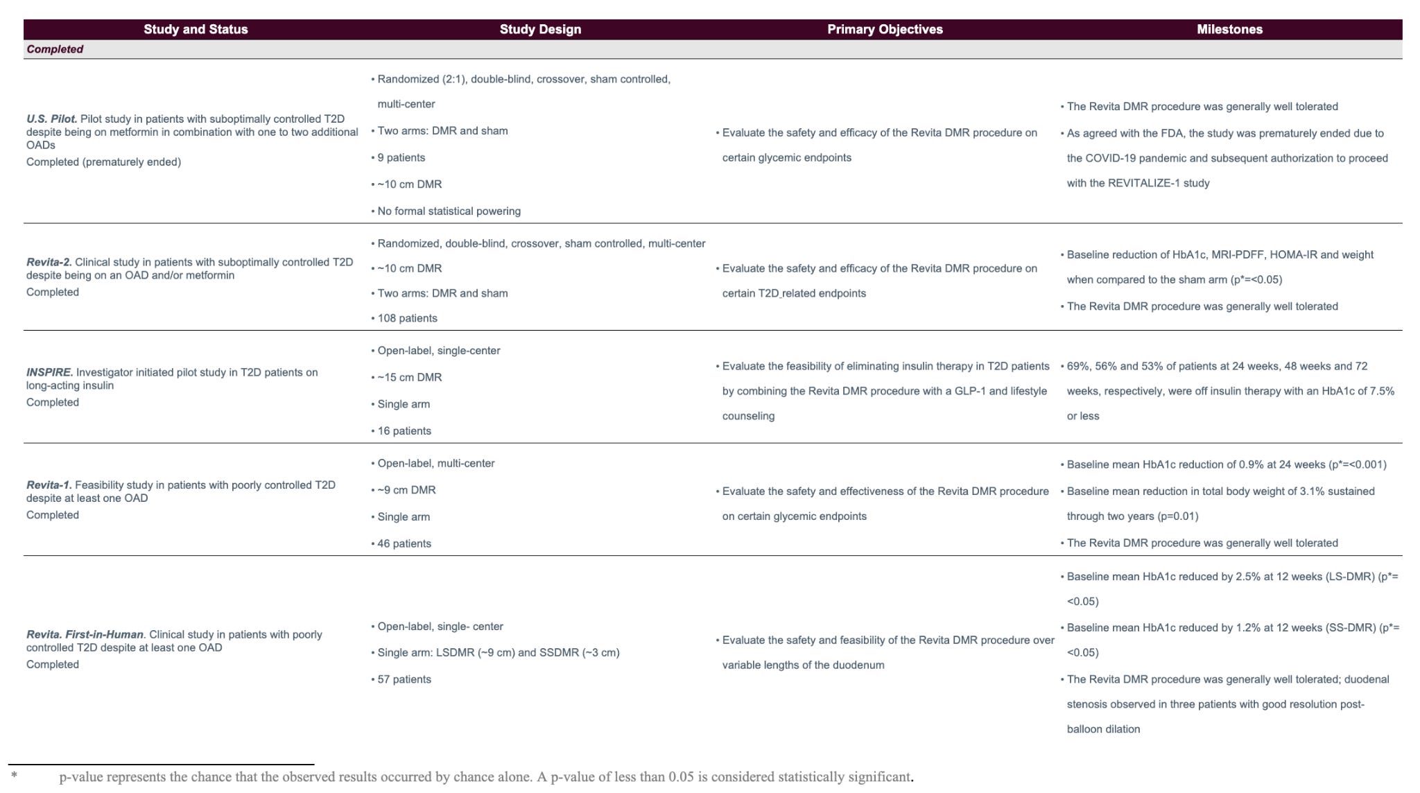 Beginning in 2013 with the company’s first-in-human trial, Revita has been trialed and published data in over 250 patients to date, the large majority of which were T2D patients. Below is a summary of all of the trials that Fractyl is either currently conducting or has conducted in the past in reverse chronological order: