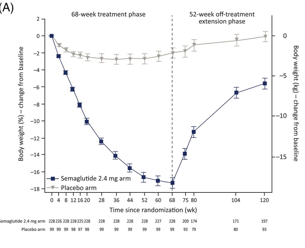 The results were similar in Novo Nordisk’s STEP-1 extension trial, which showed that patients who initially lost an average of 17% of their total body weight over 68 weeks on semaglutide regained 64% of the lost weight over the next 52 weeks after discontinuing the drug.