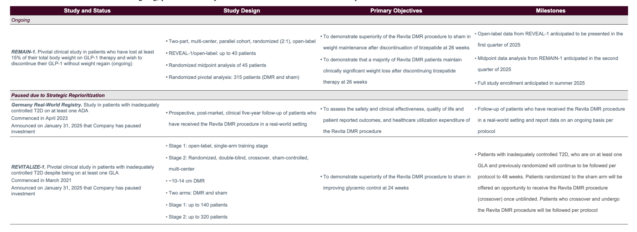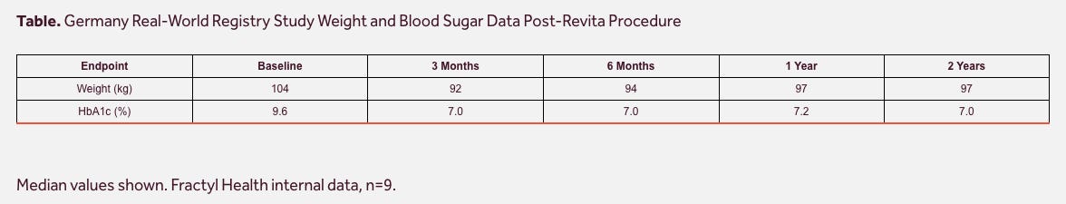 Revita is already approved in Europe as a standalone treatment for Type 2 diabetes (T2D), reporting 4-10% body weight loss and ~1.5% HbA1c reductions across 250+ patients as a standalone procedure (depending on the length of duodenal ablation), but has not really been commercialized due to the onerous requirements for achieving reimbursement in European jurisdictions, as well as, in our opinion, clear yet mediocre/uninspiring efficacy as a standalone treatment, which we also believe contributed to slow enrollment in Fractyl’s large US trial in T2D patients (the REVITALIZE trial, which was paused in January to prioritize financial resources for the GLP-1 discontinuation indication).