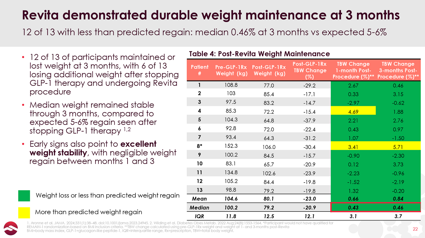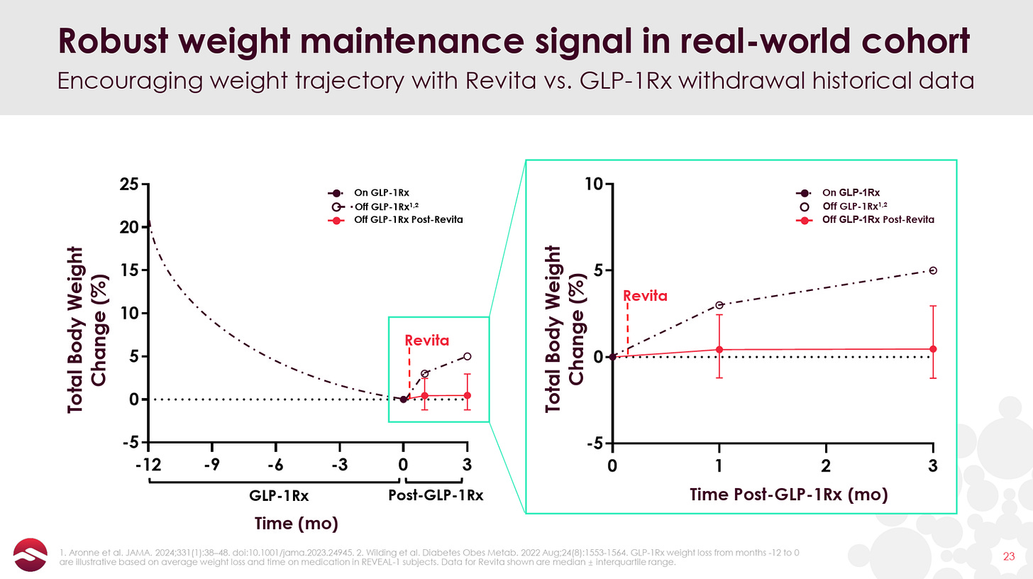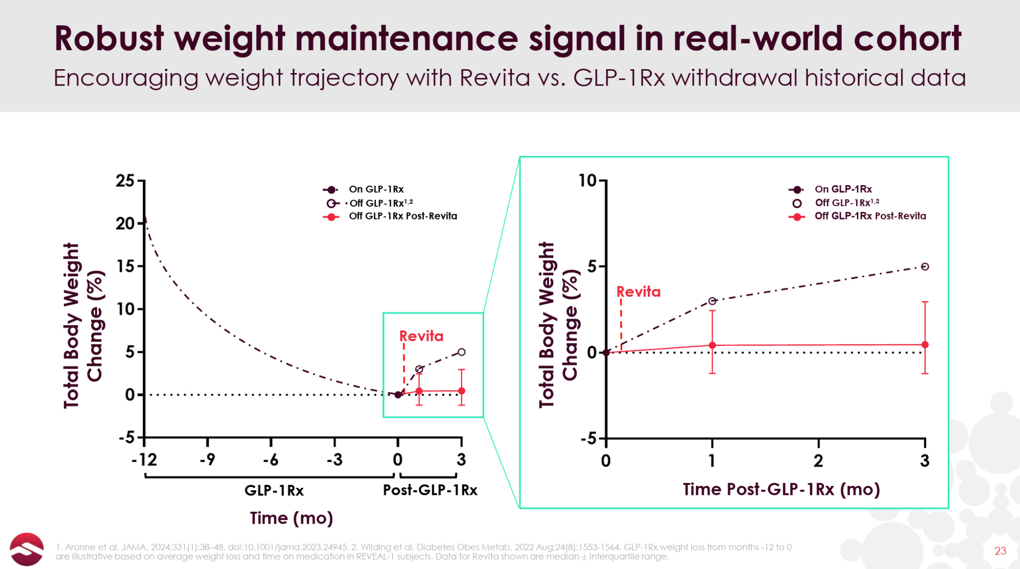 There is very limited data available for Revita in GLP-1 discontinuation patients at present. Beyond the small 13-patient open-label data, we are using Revita’s results in T2D patients to infer about GLP-1 discontinuation patients. The durability of Revita’s weight maintenance in post-GLP-1 patients, which will be crucial to its viability as a treatment, also won’t be known for at least a couple more quarters.